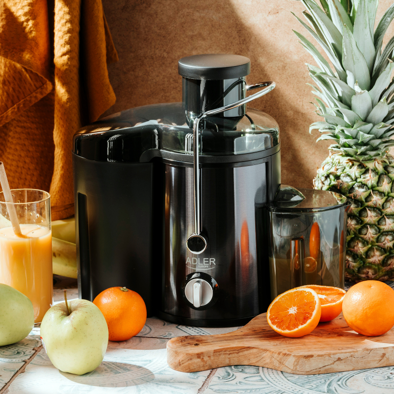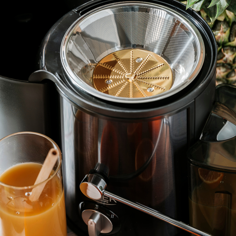 Med en kraftig 600W motor og titaniumbelagte knive presser den nemt hele frugter gennem det brede 65 mm påfyldningsrør.