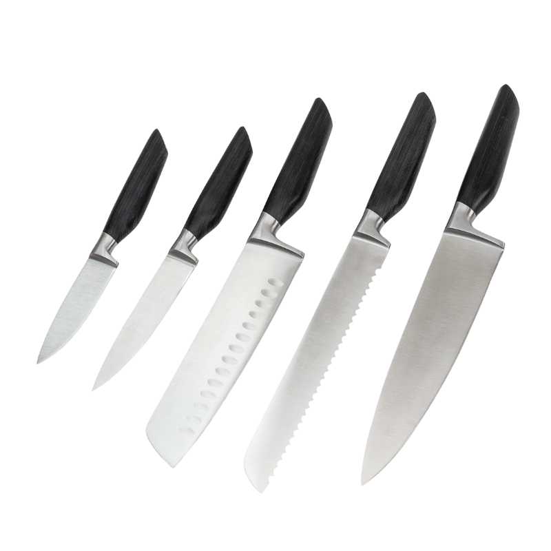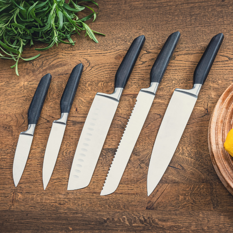 Sættet indeholder grøntsagskniv, universalkniv, Santoku, brødkniv og chefkniv – klar til enhver opgave i køkkenet.
