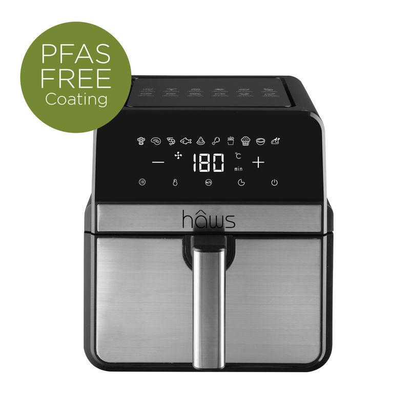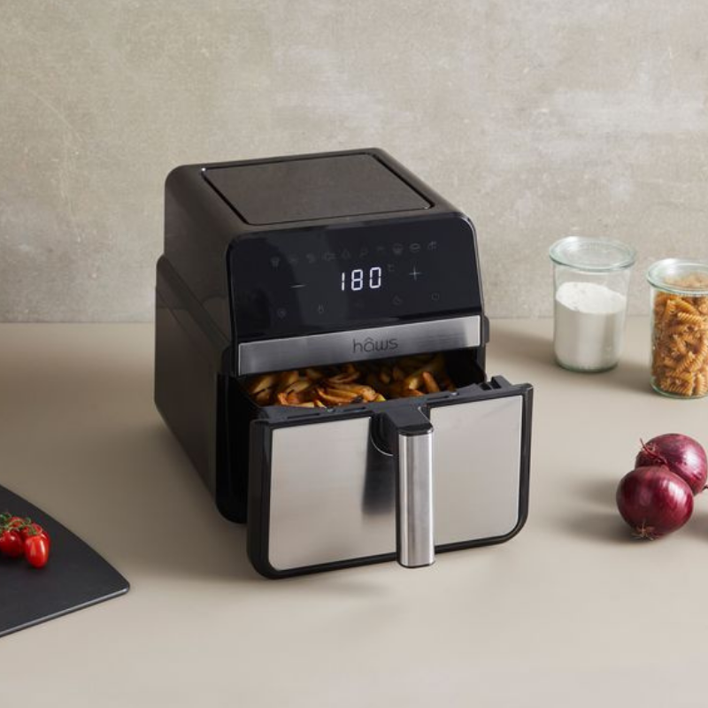 Med en imponerende kapacitet på hele 8 liter og 2100W, giver Hâws Air fryer dig mulighed for at lave store og lækre portioner – helt uden olie. De dobbelte varmeelementer og den avancerede 360° termiske luftcirkulation sikrer en hurtig, jævn og sprød tilberedning hver gang. 10 forudindstillede programmer gør det let at vælge det rette til dine favoritretter, og med et intuitivt digitalt display justerer du nemt tid og temperatur fra 80 til 200°C. Timeren går op til 60 minutter, og når maden er færdig, giver airfryeren lyd og slukker automatisk. PFAS-fri belægning og overophedningsbeskyttelse sikrer en sund og tryg madlavningsoplevelse, mens den store skuffe med non-stick overflade gør rengøringen nem. Gør hverdagen nemmere og grønnere – med Hâws Airfryer får du både funktion, kapacitet og sundhed i én og samme maskine.