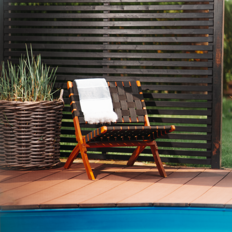 En loungestol, der kombinerer naturlig skønhed med praktisk funktionalitet – skabt til at følge med i både hjemmets og uderummets liv.