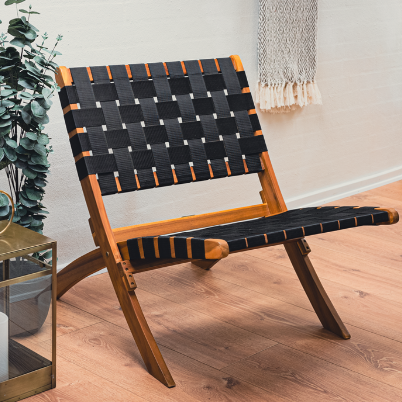 Fremstillet i FSC-certificeret akacietræ, oliebehandlet for et luksuriøst finish, og med sort, vejrbestandigt PE-flet, der tåler både sol og regn.